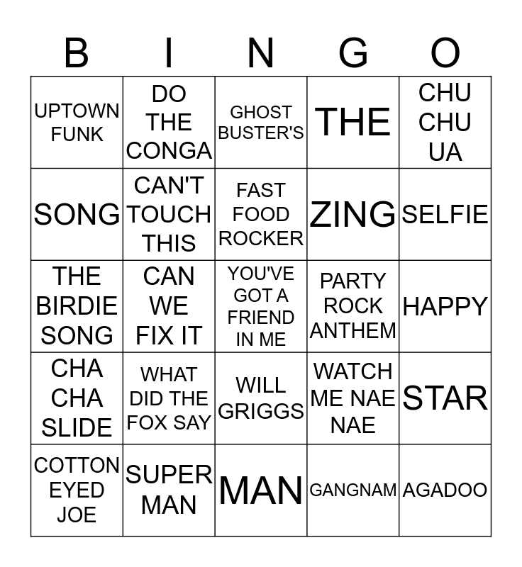 This bingo card has 33 words: AGADOO, BARBIE GIRL, CAN WE FIX IT, BOOM! BOOM! BOOM!, CHA CHA SLIDE, CAN'T TOUCH THIS, CHU CHU UA, COTTON EYED JOE, DO THE CONGA, DON'T STOP WIGGLE WIGGLE, FAST FOOD ROCKER, GHOST BUSTER'S, HOKEY COKEY, MAMBO NO 5, PARTY ROCK ANTHEM, SELFIE, SUPER MAN, THE BIRDIE SONG, WHAT DID THE FOX SAY, WATCH ME NAE NAE, WILL GRIGGS, WE LIKE TO PARTY, UPTOWN FUNK, HAPPY, MAN, YOU'VE GOT A FRIEND IN ME, THE, ZING, SONG, STAR, WARS, GANGNAM and STYLE.