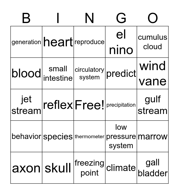 This bingo card has a free space and 24 words: species, skull, circulatory system, axon, cumulus cloud, generation, blood, heart, precipitation, thermometer, predict, jet stream, low pressure system, marrow, small intestine, climate, gulf stream, reproduce, wind vane, reflex, gall bladder, behavior, el nino and freezing point.