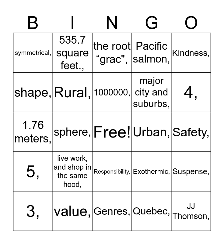 This bingo card has a free space and 67 words: Hyperbole,, Third Person Omniscient,, Personification,, Suspense,, 5.24,, $8.50,, 535.7 square feet.,, 0.05,, 1000000,, Ready to Learn,, Responsibility,, Respect,, Safety,, Kindness,, orange,, shape,, sphere,, symmetrical,, horizontal,, major city and suburbs,, live work, and shop in the same hood,, 5,, Pacific salmon,, Quebec,, 2 beats,, Vocal Range,, Vocal Expression,, pantomime,, 4,, how packed particles are,, JJ Thomson,, Quickly and spread out,, Reactants,, gas production,, Patriots,, 3,, destroyed,, Exothermic,, 1.76 meters,, 100,, 2,, Rural,, Urban,, Winnipeg,, Charlottetown,, Regina,, Victoria,, value,, primary,, texture,, the root “grac",, examples of sequence,, the root “fig",, simile,, onomatopoeia,, Genres,, Plot,, Context clues,, Visualizing,, Making inferences,, Compare and Contrast,, A Growth Mindset,, It also increases,, it remains the same,, the law of conservation of mass,, move faster and spread apart, and 5 g/cm3,.
