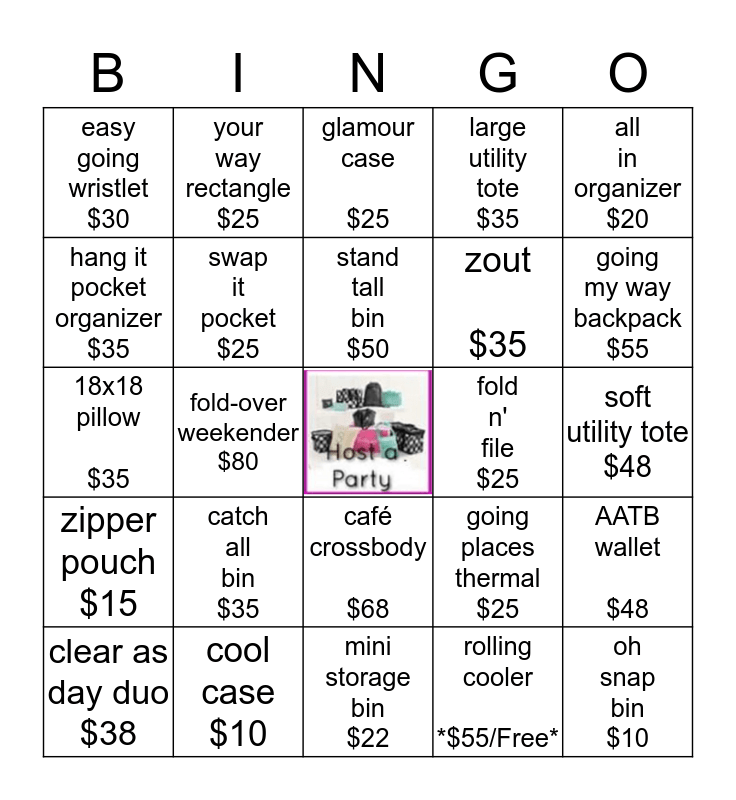 This bingo card has a free space and 24 words: catch all bin $35, cool case $10, stand tall bin $50, clear as day duo $38, all in organizer $20, easy going wristlet $30, hang it pocket organizer $35, your way rectangle $25, fold n' file $25, café crossbody $68, zout $35, 18x18 pillow $35, going places thermal $25, AATB wallet $48, swap it pocket $25, rolling cooler *$55/Free*, soft utility tote $48, glamour case $25, going my way backpack $55, fold-over weekender $80, oh snap bin $10, zipper pouch $15, large utility tote $35 and mini storage bin $22.