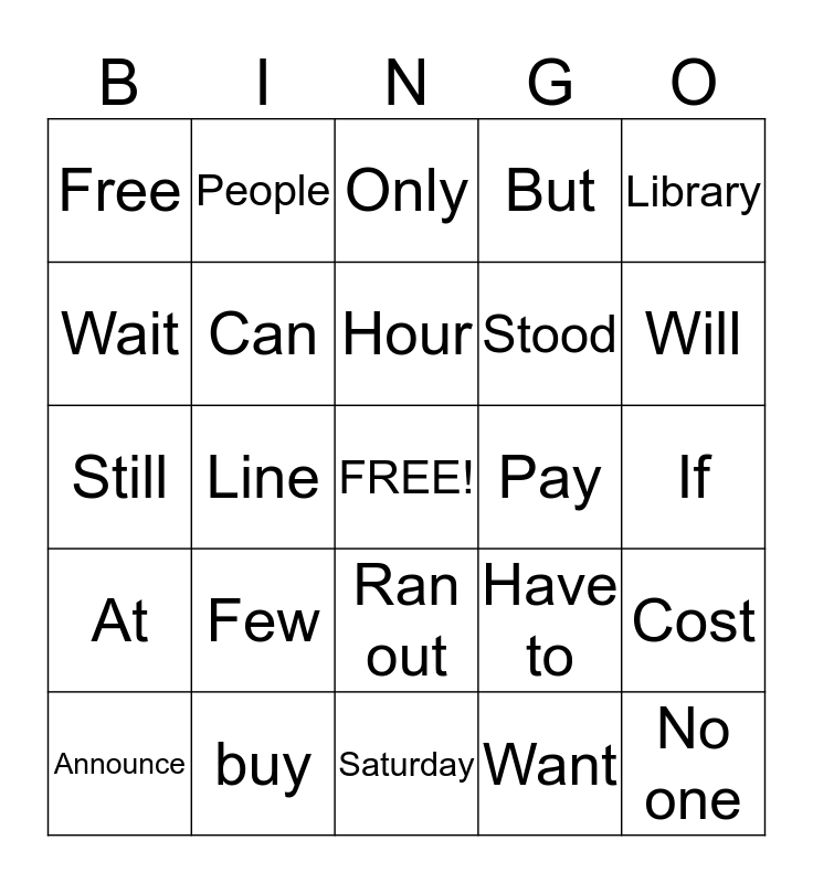 This bingo card has a free space and 24 words: Few, buy, Hour, Announce, Library, Free, Wait, People, Pay, Ran out, Stood, Still, Have to, Cost, Can, Want, If, Only, Will, Line, No one, At, But and Saturday.