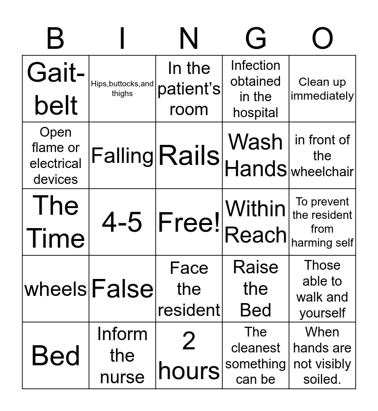 This bingo card has a free space and 25 words: False, 2 hours, Rails, Bed, Clean up immediately, Gait-belt, Open flame or electrical devices, Hips,buttocks,and thighs, Within Reach, Face the resident, Wash Hands, The Time, Raise the Bed, Those able to walk and yourself, Falling, Ask if the water temperature is ok, To prevent the resident from harming self, In the patient’s room, in front of the wheelchair, 4-5, When hands are not visibly soiled., Inform the nurse, wheels, Infection obtained in the hospital and The cleanest something can be.