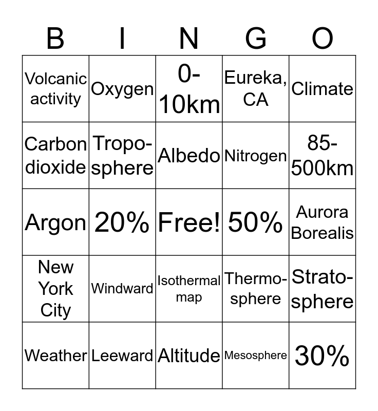 This bingo card has a free space and 24 words: Windward, Leeward, Albedo, Weather, Climate, Volcanic activity, Carbon dioxide, Oxygen, 50%, Isothermal map, Nitrogen, Argon, Thermo-sphere, Strato-sphere, Tropo-sphere, Mesosphere, Aurora Borealis, 0-10km, 85-500km, 20%, 30%, New York City, Eureka, CA and Altitude.