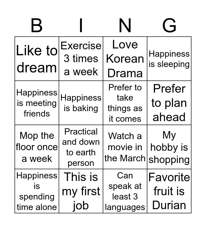 This bingo card has 16 words: This is my first job, My hobby is shopping, Love Korean Drama, Like to dream, Mop the floor once a week, Exercise 3 times a week, Watch a movie in the March, Can speak at least 3 languages, Happiness is meeting friends, Happiness is baking, Happiness is spending time alone, Happiness is sleeping, Practical and down to earth person, Prefer to plan ahead, Prefer to take things as it comes and Favorite fruit is Durian.