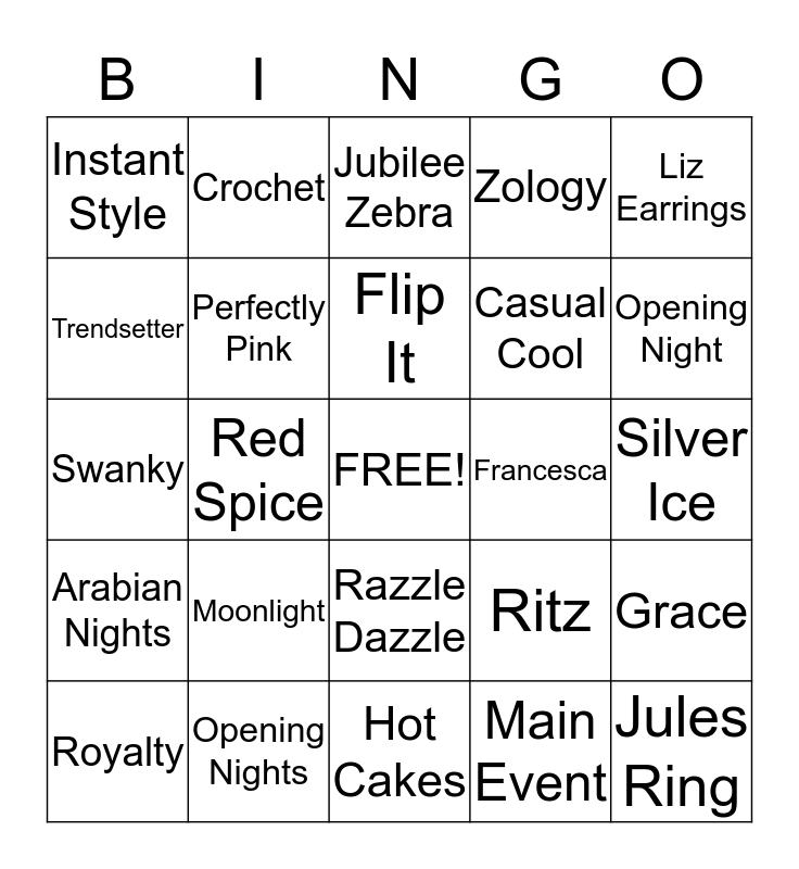 This bingo card has a free space and 24 words: Moonlight, Opening Nights, Flip It, Royalty, Liz Earrings, Instant Style, Trendsetter, Crochet, Francesca, Razzle Dazzle, Casual Cool, Swanky, Ritz, Grace, Perfectly Pink, Main Event, Silver Ice, Jubilee Zebra, Opening Night, Red Spice, Jules Ring, Arabian Nights, Zology and Hot Cakes.