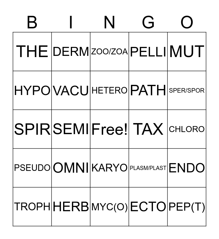 This bingo card has a free space and 24 words: OMNI, HERB, HETERO, TROPH, MUT, THE, HYPO, DERM, TAX, KARYO, PATH, SPIR, PLASM/PLAST, ENDO, VACU, ECTO, CHLORO, ZOO/ZOA, SPER/SPOR, SEMI, PEP(T), PSEUDO, PELLI and MYC(O).
