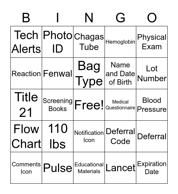 This bingo card has a free space and 24 words: 110 lbs, Pulse, Bag Type, Comments Icon, Physical Exam, Tech Alerts, Reaction, Photo ID, Medical Questionnaire, Notification Icon, Name and Date of Birth, Title 21, Deferral Code, Deferral, Fenwal, Lancet, Blood Pressure, Chagas Tube, Lot Number, Screening Books, Expiration Date, Flow Chart, Hemoglobin and Educational Materials.
