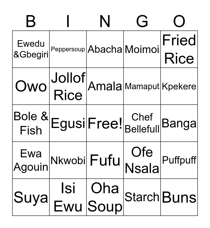 This bingo card has a free space and 24 words: Nkwobi, Isi Ewu, Amala, Suya, Fried Rice, Ewedu &Gbegiri, Owo, Peppersoup, Chef Bellefull, Fufu, Mamaput, Bole & Fish, Ofe Nsala, Puffpuff, Jollof Rice, Starch, Banga, Abacha, Kpekere, Egusi, Buns, Ewa Agouin, Moimoi and Oha Soup.
