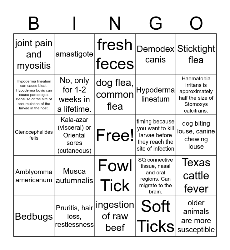 This bingo card has a free space and 269 words: 2nd stage schizogony in vascular endothelium, 3rd stage schizogony in nervous tissue, 70% alcohol, Abortion at 3-9 months, Accumulate in the epidural fat of the spinal cord. Eggs are laid singly., accumulate in the submucosa of the esophagus. Eggs are laid in lines on the lower limbs., All the time, amastigote, amastigotes in macrophages, Amblyomma americanum, Anemia, Anoplocephala perfoliata, Anoplocephala perfoliata/magna, Anoplura are sucking lice with a narrow head that cause anemia. Ischocera are chewing lice with a wide head that cause pruritis., Anoplura spp., around the face, Assasin bug or kissing bug, Babesia bigemina, Babesia canis, Babesia Spp, Back, around horns and belly, Balantidium coli, Bebesia spp, Because females only mate once in a lifetime, Bedbugs, Binary fission, budding or schizogony and sporogony, birds, Biting/chewing lice, can cause pathology in heart muscles --> acute and chronic cardiac disease, Canker and Frounce, cat flea, jumping flea, Cats, cattle biting louse, cattle, herbivores, omnivores, birds, Chew, Cheyletiella yasguri, Chorioptes bovis, Chrysops spp., clinical signs, western blot, PCR, Coccidia, Coccidia, Cochliomyia hominivorax, coitus, Cow feces, Cracks and crevices in cages, Cryptosporidium andersoni, Cryptosporidium hominis, Cryptosporidium parvum, Cryptosporidium spp., Ctenocephalides felis, Culicoides, Cull and Report, Cuterebra spp., the cyst, Cytauxzoon felis, Dark cerumen, decaying hay and other organic matter, deep skin scraping, hair pluck, cytology, Demodex canis, depression, anorexia, anemia and spenomegaly, Dermacentor, Dermanyssus spp., destruction of red blood cells, Destruction of small intestine cells leading to diarrhea, diarrhea, Direct contact with brushes, bedding, etc, Dog biting louse, dog biting louse, canine chewing louse, dog flea, dog flea, common flea, Dogs and cats, Dogs and felids, Dog sucking louse, Drashcia megastoma, habronema spp, Duodenal ulcerations, malabsorption, acute focal inflammation, Duodenum and pylorus, Early abortions, Ear mite, eating undercooked meat, consuming water/food contaminated with cat feces, transplacentally from mother to fetus, Echidnophaga spp., Eggs and Nymphs. Adults do not stay on host., Eimeria, Eimeria leukarti, Eimeria or Coccidia, Eimeria spp., Eimeria tenella, ENNA, ENNNA, enteritis and dysentry, Equine protozoal myeloencephalitis, face fly, Fecal Floatation to detect oocyst, feces and rotting organic matter, Felicola subrostraus, felinds, Feline trichomonas, Fleas, flea saliva, Flesh flies, Floatations or McMaster, Flystrike, Fly worry, Fowl, Fowl. NOT chickens, Fowl Tick, fresh feces, Gamonts in white blood cells, Gasterophilus Intestinalis, Gasterophilus nasalis, Giardia, Giardia intestinalis, Haematobia irritans, Haematobia irritans is approximately half the size of Stomoxys calcitrans., Haematopinous spp., Head, Hepatozoon (americanum), Hepatozoon Spp, Histomonas spp., Histomonas spp, Horn fly, Horse, Horse fly, Hypoderma, Hypoderma lineatum, Hypoderma lineatum can cause bloat. Hypoderma bovis can cause paraplegia. Because of the site of accumulation of the larvae in the host., Hypoderma spp., If lesioned, the parasite can cause a Type I hypersensitivity reaction in the host., Infectious catarrhal enteritis, Infectious enterohepatitis, Infestation of a living animal with diptheran fly larvae. This can be facultative or obligatory., ingestion of raw beef, In GI tract, In muscles, In numbers over 200, Inside sheep nostrils, In sores, wounds, necrotic tissue and soiled wool., Intermandibular area, Intermittent feeders, In the GI tract ( stomach, duodenum), In the tick vector, Ioxodes, Ischnocera louse, Ischnocera spp., Ischnocerca (BITING lice), Isospora, Isospora and Eimeria, Isospora suis, itching, weightloss, reduced egg yield, It has two forms. Histomonas is flagellated in the cecum and pseudopodal in the liver., It is a vector for D. caninum, It is the most pathogenic and causes production losses, It usually infects the eye or lip and does not develop further., Ixoeds, joint pain and myositis, Kala-azar (visceral) or Oriental sores (cutaneous), Keratin digestion, sleeplessness, inappetance, scratching, feather plucking, Keratinization of skin on legs and/or face, Kissing bug, Knemidocoptes spp., Large, robust, beelike, hairy flies with nonfunctional mouthparts. Short lived, obligatory parasites, Larvae and nymphs, Leg, comb, wattle and neck, Leishmania spp., Leucocytozoon spp., Linognathis setosus, listlessness, anemia, labored breathing, CNS symptoms and death, Litte blue cattle louse, livestock, Long nosed cattle louse, malnutrition or chronic disease, margo plicatus and cardiac regions, Melophagus ovinus, Mode of locomotion, Musca autumnalis, Musca domestica, Musca domestica and Musca autumnalis, Nasal passages and sinuses, necropsy, Neospora spp., neurons, New World Screwworm, No, demodex is a normal inhabitant of skin., No, its the aberrant host., None. a single egg hatches inside the female's body at a time., No, only for 1-2 weeks in a lifetime., Northern/Tropical fowl mite, No-see-ums, midges, Notoedric cat mite, occlusion of blood vessels because of infected cell enlargement, Oestridae, Oestrus ovis, older animals are more susceptible, Onchocerca cervicalis, On fresh, uninfected wounds., On hairless areas of the body, lateral elbow and ear pinna, only when feeding at night, opossum, Oral-nasal cavity and upper GI, Ornithonyssus spp., Otodectes Cynotis, oxyuris equi, Paraplegia, PCR or In Pouch TF (culture), pigeon milk, contaminated drinking water and paratenic infection, Pruritis, hair loss, restlessness, Psoroptes, Cheyletiella and Chorioptes, Psoroptes ovis, Psoroptes ovis, rabbits, rodents, raw beef, Red chicken/ Roost mite, night mite, Reduviidae, Reduviid bug, Report it!, Rhipicephalus sanguineus, ruminants and equids, Sucking, Sugar floatation or sedimentation, Swab the ear wax, Swine sucking louse, Tabanus spp