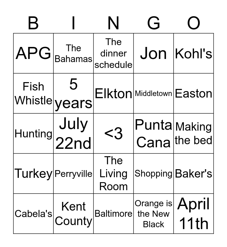 This bingo card has a free space and 24 words: Perryville, Kent County, Elkton, Cabela's, Kohl's, APG, Fish Whistle, The Bahamas, Punta Cana, The Living Room, Middletown, Hunting, Shopping, Baker's, 5 years, Orange is the New Black, Making the bed, The dinner schedule, Easton, July 22nd, April 11th, Turkey, Jon and Baltimore.