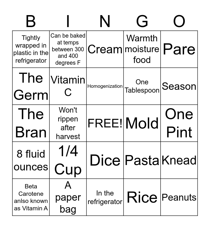 This bingo card has a free space and 24 words: 1/4 Cup, A paper bag, Homogenization, Beta Carotene anlso known as Vitamin A, Pare, Tightly wrapped in plastic in the refrigerator, The Germ, Can be baked at temps between 300 and 400 degrees F, Mold, Dice, One Tablespoon, The Bran, Pasta, Knead, Vitamin C, Rice, One Pint, Cream, Season, Won't rippen after harvest, Peanuts, 8 fluid ounces, Warmth moisture food and In the refrigerator.
