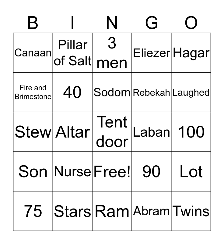 This bingo card has 26 words: Free!, Abram, Sodom, Stars, Hagar, Canaan, Fire and Brimestone, Pillar of Salt, 100, 90, Rebekah, Stew, Lot, 75, Altar, Being Childless, Eliezer, Son, 3 men, Tent door, Laughed, Ram, Laban, Nurse, 40 and Twins.