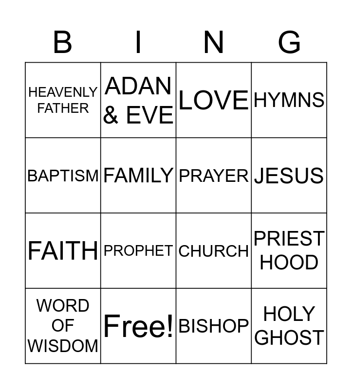 This bingo card has 24 words: BOOK OF MORMON, TEMPLE, JESUS, NEPHI, BAPTISM, HEAVENLY FATHER, FAMILY, ADAN & EVE, Free!, JOSEPH SMITH, FAITH, CHURCH, TITHING, BIBLE, PRAYER, PRIMARY, BISHOP, LOVE, PROPHET, PRIEST HOOD, WORD OF WISDOM, HOLY GHOST, HYMNS and ELDERS.
