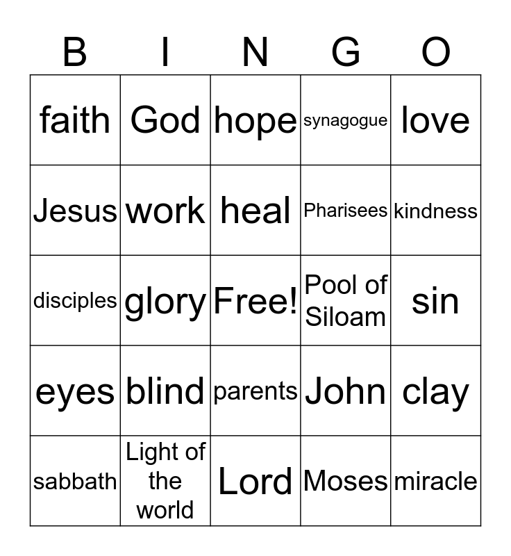 This bingo card has a free space and 24 words: blind, Light of the world, heal, sabbath, love, faith, Jesus, God, Pool of Siloam, parents, Pharisees, disciples, John, clay, work, Moses, sin, hope, kindness, glory, miracle, eyes, synagogue and Lord.