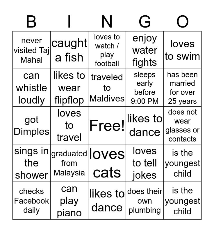 This bingo card has a free space and 24 words: graduated from Malaysia, can play piano, traveled to Maldives, checks Facebook daily, loves to swim, never visited Taj Mahal, can whistle loudly, caught a fish, likes to dance, loves cats, sleeps early before 9:00 PM, got Dimples, loves to tell jokes, is the youngest child, likes to wear flipflop, does their own plumbing, does not wear glasses or contacts, loves to watch / play football, has been married for over 25 years, loves to travel, is the youngest child, sings in the shower, enjoy water fights and likes to dance.