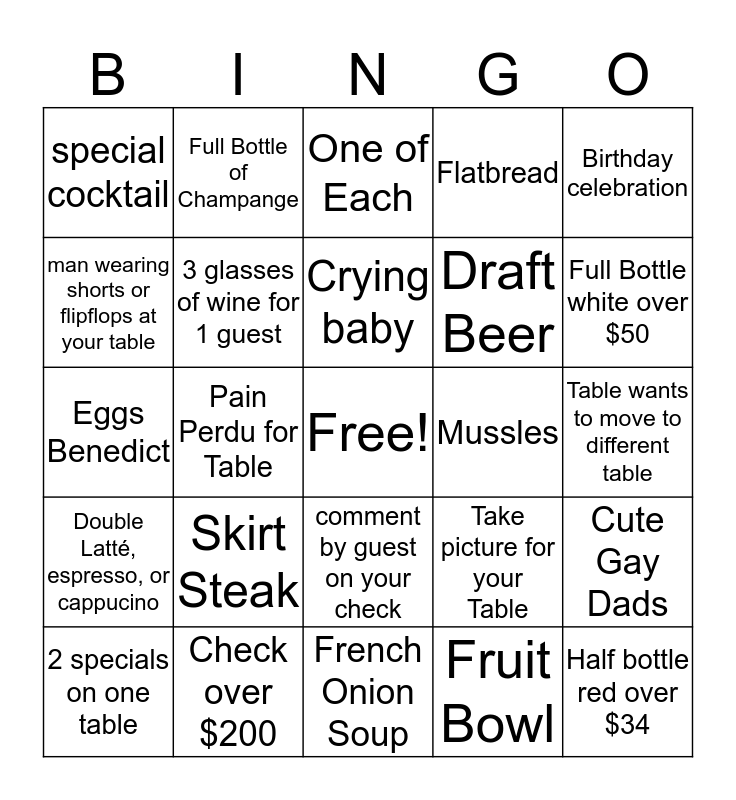 This bingo card has a free space and 24 words: Skirt Steak, Check over $200, Crying baby, 2 specials on one table, Birthday celebration, special cocktail, man wearing shorts or flipflops at your table, Full Bottle of Champange, Mussles, comment by guest on your check, Draft Beer, Eggs Benedict, Take picture for your Table, Cute Gay Dads, 3 glasses of wine for 1 guest, Fruit Bowl, Table wants to move to different table, One of Each, Full Bottle white over $50, Pain Perdu for Table, Half bottle red over $34, Double Latté, espresso, or cappucino, Flatbread and French Onion Soup.