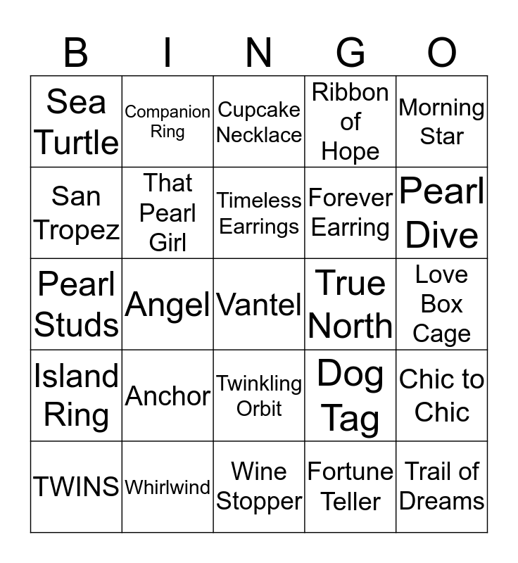 This bingo card has 51 words: Free!, Vantel, 3 of Hearts, Wine Stopper, Anchor, Swing Me, Companion Ring, Hip Hop, San Tropez, Mermaid, That Pearl Girl, Ribbon of Hope, Chic to Chic, Dog Tag, Wild Flower Ring, Lotus, Timeless Earrings, True North, Innocence Ring, Morning Star, Angel, Fortune Teller, Sea Turtle, Forever Earring, Princess Crown Stretch, Trail of Dreams, Pearl Dive, Infinite Love, TWINS, Cupcake Necklace, Feather in the Wind, Heart Rope Wrap, Breezy, Sea Glass, Twister, Whirlwind, Love me 2 Times, 3 of Diamonds, Skydancer, Mothers Love, Love Box Cage, Island Ring, Believe Bangle, Date Night, Save my Place, Time t Soar, Pearl Studs, Candle Holder, Charm Anklet, Twinkling Orbit and Wine Charms.