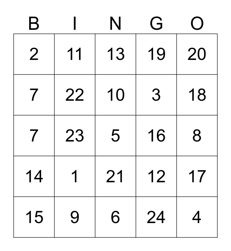 This bingo card has 25 words: 1, 6, 10, 15, 20, 2, 7, 11, 16, 21, 3, 7, 12, 17, 22, 4, 8, 13, 18, 23, 5, 9, 14, 19 and 24.
