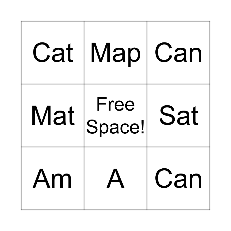 This bingo card has a free space and 8 words: Sat, Can, Map, Am, Cat, Can, Mat and A.