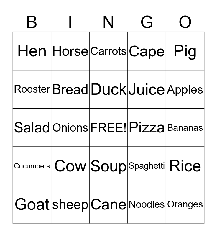This bingo card has a free space and 24 words: Cow, sheep, Duck, Goat, Pig, Hen, Rooster, Horse, Pizza, Soup, Juice, Salad, Spaghetti, Rice, Bread, Noodles, Bananas, Carrots, Apples, Onions, Oranges, Cucumbers, Cape and Cane.