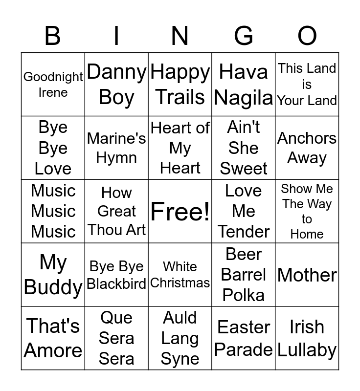 This bingo card has a free space and 24 words: Bye Bye Blackbird, Que Sera Sera, Heart of My Heart, That's Amore, This Land is Your Land, Goodnight Irene, Bye Bye Love, Danny Boy, Love Me Tender, White Christmas, Ain't She Sweet, Music Music Music, Beer Barrel Polka, Mother, Marine's Hymn, Easter Parade, Show Me The Way to Home, Happy Trails, Anchors Away, How Great Thou Art, Irish Lullaby, My Buddy, Hava Nagila and Auld Lang Syne.