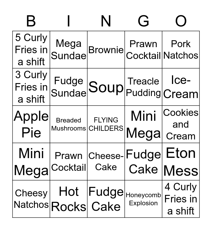 This bingo card has a free space and 24 words: Prawn Cocktail, Hot Rocks, Soup, Cheesy Natchos, Pork Natchos, 5 Curly Fries in a shift, 3 Curly Fries in a shift, Mega Sundae, Mini Mega, Cheese- Cake, Treacle Pudding, Apple Pie, Fudge Cake, Eton Mess, Fudge Sundae, Honeycomb Explosion, Cookies and Cream, Brownie, Ice- Cream, Breaded Mushrooms, 4 Curly Fries in a shift, Mini Mega, Prawn Cocktail and Fudge Cake.