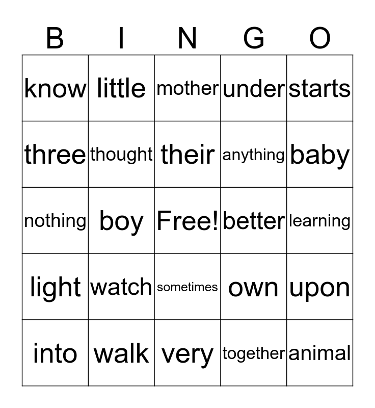 This bingo card has a free space and 24 words: watch, walk, their, into, starts, know, three, little, better, sometimes, anything, nothing, own, upon, thought, together, learning, mother, baby, boy, animal, light, under and very.