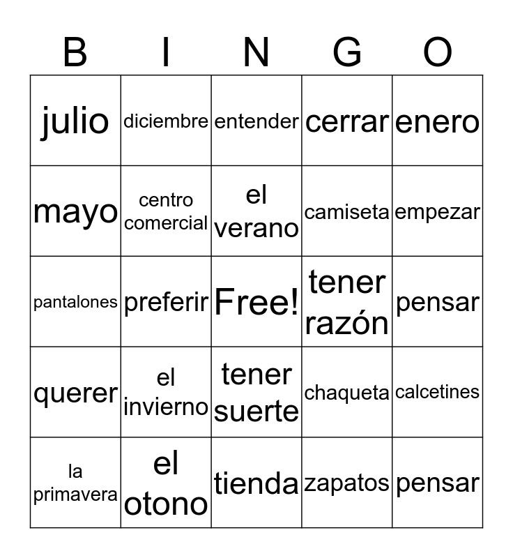 This bingo card has a free space and 24 words: el invierno, el otono, el verano, la primavera, enero, julio, mayo, diciembre, tener razón, tener suerte, camiseta, pantalones, chaqueta, calcetines, centro comercial, zapatos, pensar, entender, empezar, preferir, pensar, querer, cerrar and tienda.