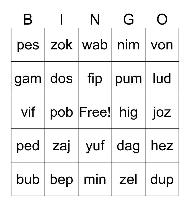 This bingo card has a free space and 24 words: zaj, bep, fip, bub, von, pes, gam, zok, hig, yuf, pum, vif, dag, hez, dos, zel, joz, wab, lud, pob, dup, ped, nim and min.