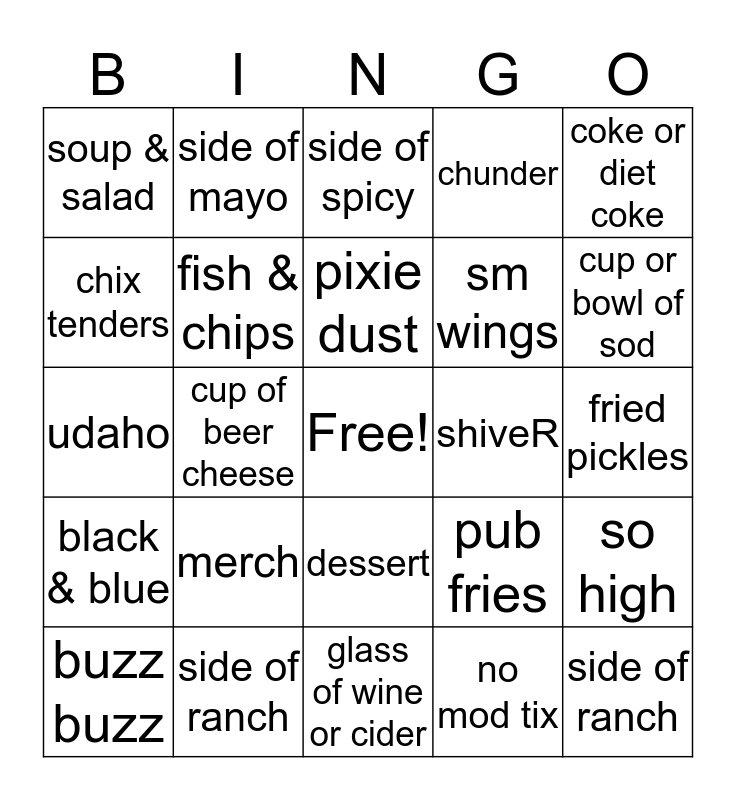 This bingo card has a free space and 24 words: merch, side of ranch, pixie dust, buzz buzz, coke or diet coke, soup & salad, chix tenders, side of mayo, shiveR, dessert, sm wings, udaho, pub fries, so high, fish & chips, no mod tix, fried pickles, side of spicy, cup or bowl of sod, cup of beer cheese, side of ranch, black & blue, chunder and glass of wine or cider.