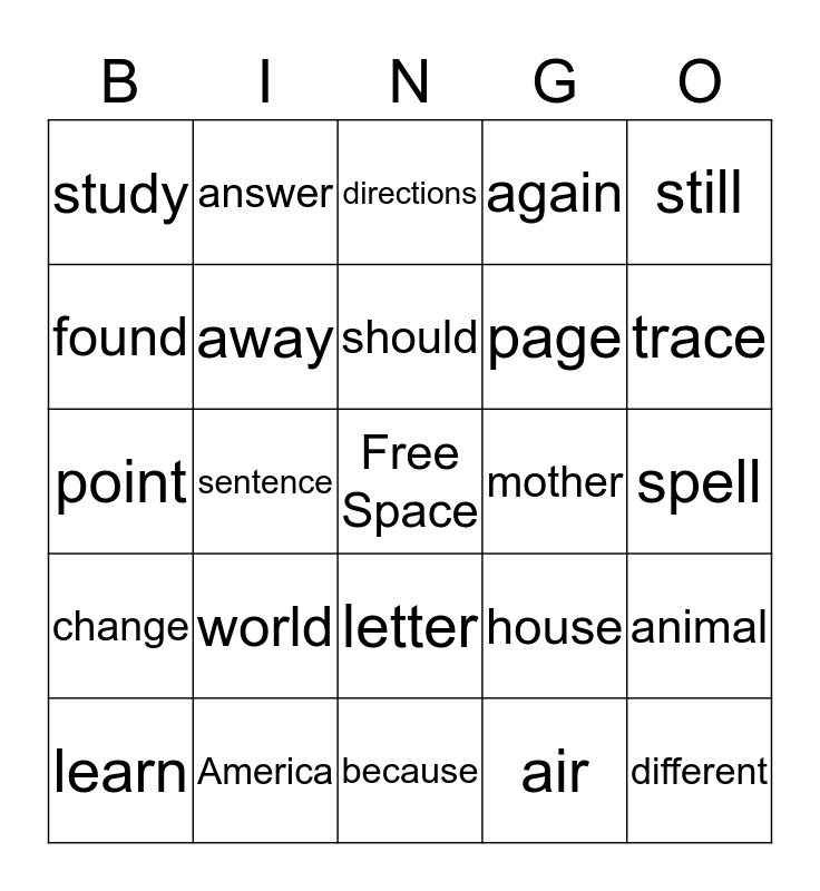This bingo card has a free space and 24 words: world, America, should, learn, still, study, found, answer, mother, letter, page, point, house, animal, away, air, spell, directions, trace, sentence, different, change, again and because.