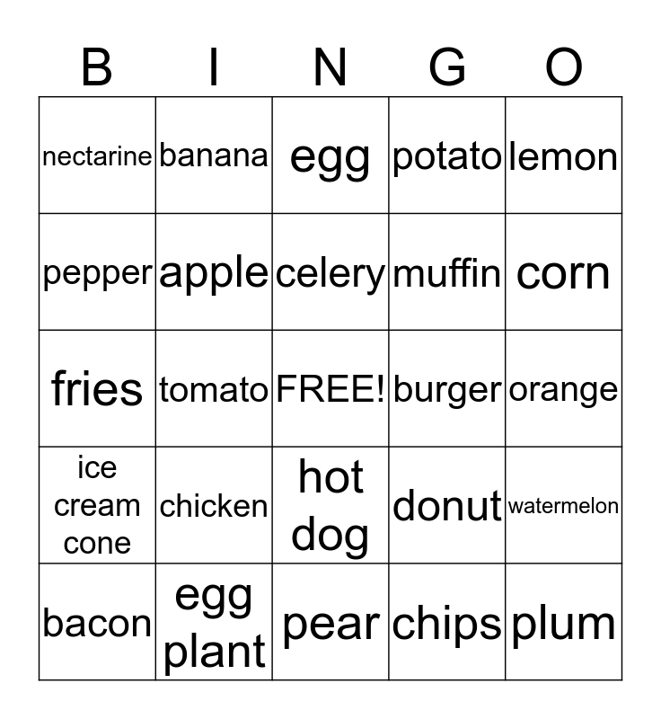 This bingo card has a free space and 34 words: peas, chips, bread, onion, ice cream cone, apple, lemon, bacon, banana, carrot, celery, egg, chocolate, mushroom, burger, corn, egg plant, fries, chicken, donut, hot dog, lettuce, nectarine, orange, pear, plum, potato, grapes, muffin, pepper, strawberry, tomato, watermelon and peanut butter and jelly.