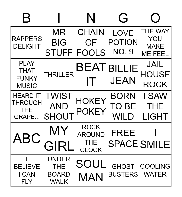 This bingo card has a free space and 24 words: MY GIRL, UNDER THE BOARD WALK, BEAT IT, I BELIEVE I CAN FLY, THE WAY YOU MAKE ME FEEL, RAPPERS DELIGHT, PLAY THAT FUNKY MUSIC, MR BIG STUFF, BORN TO BE WILD, ROCK AROUND THE CLOCK, BILLIE JEAN, HEARD IT THROUGH THE GRAPE..., FREE SPACE, I SMILE, THRILLER, GHOST BUSTERS, I SAW THE LIGHT, CHAIN OF FOOLS, JAIL HOUSE ROCK, TWIST AND SHOUT, COOLING WATER, ABC, LOVE POTION NO. 9 and SOUL MAN.