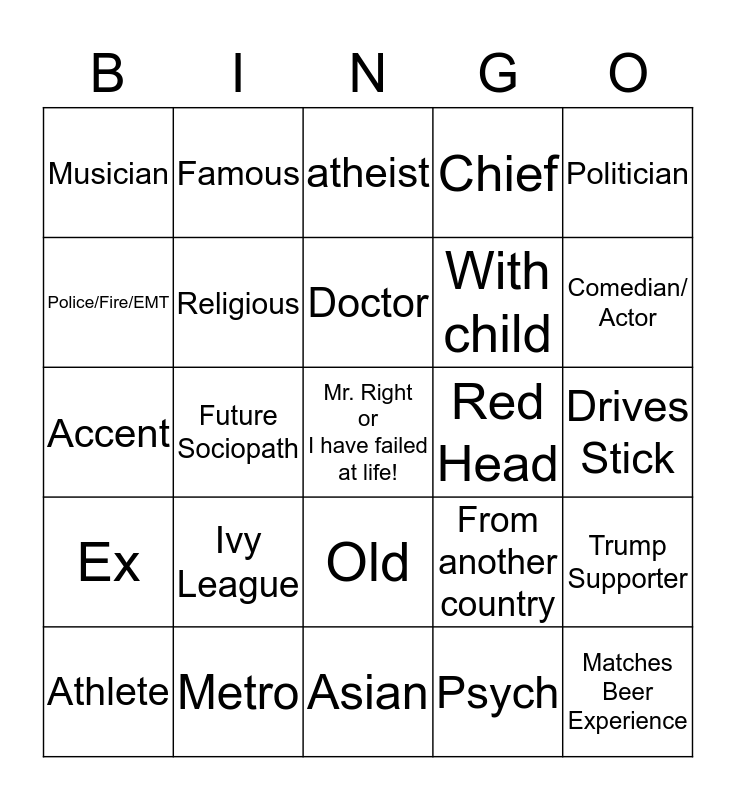 This bingo card has a free space and 24 words: Ivy League, Metro, Doctor, Athlete, Politician, Musician, Police/Fire/EMT, Famous, Red Head, Old, With child, Accent, From another country, Trump Supporter, Religious, Psych, Drives Stick, atheist, Comedian/ Actor, Future Sociopath, Matches Beer Experience, Ex, Chief and Asian.