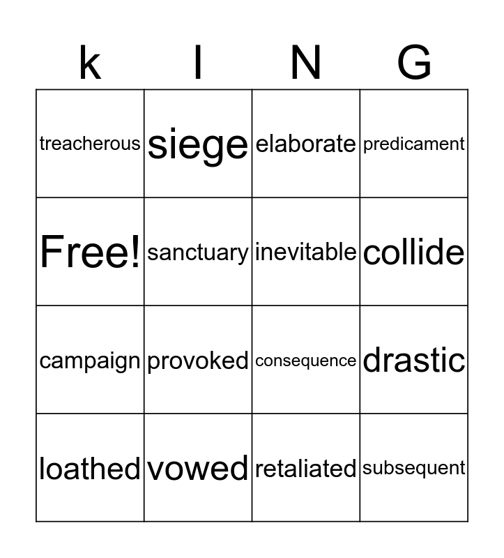 This bingo card has 16 words: vowed, drastic, elaborate, treacherous, campaign, siege, consequence, retaliated, Free!, sanctuary, loathed, predicament, provoked, collide, inevitable and subsequent.