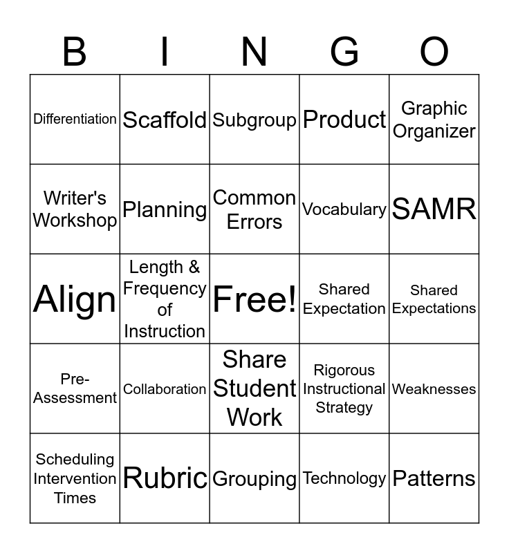 This bingo card has a free space and 24 words: Collaboration, Rubric, Common Errors, Scheduling Intervention Times, Graphic Organizer, Differentiation, Writer's Workshop, Scaffold, Shared Expectation, Share Student Work, Vocabulary, Align, Rigorous Instructional Strategy, Weaknesses, Planning, Technology, Shared Expectations, Subgroup, SAMR, Length & Frequency of Instruction, Patterns, Pre-Assessment, Product and Grouping.