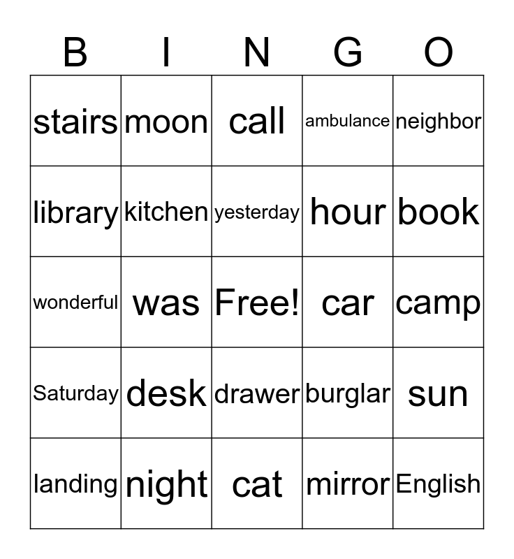This bingo card has a free space and 26 words: drawer, mirror, yesterday, night, neighbor, stairs, library, moon, camp, burglar, hour, wonderful, sun, landing, was, plane, ambulance, Saturday, call, English, book, cat, car, desk, kitchen and clock.