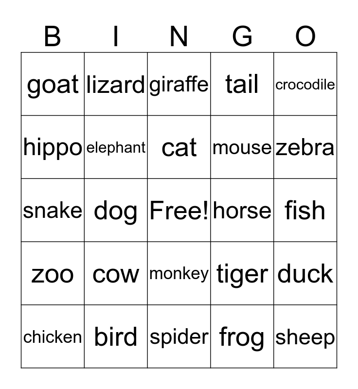 This bingo card has a free space and 24 words: cow, bird, cat, chicken, crocodile, goat, hippo, lizard, horse, monkey, mouse, snake, tiger, duck, elephant, frog, fish, giraffe, zebra, dog, sheep, zoo, tail and spider.