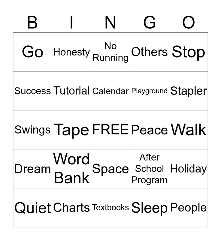 This bingo card has a free space and 24 words: Word Bank, Charts, Calendar, Quiet, Stop, Go, Success, Honesty, Peace, Space, Playground, Swings, After School Program, Holiday, Tutorial, Sleep, Walk, No Running, Stapler, Tape, People, Dream, Others and Textbooks.