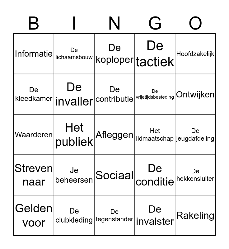 This bingo card has a free space and 24 words: Je beheersen, De clubkleding, De contributie, Gelden voor, Hoofdzakelijk, Informatie, De kleedkamer, De lichaamsbouw, Het lidmaatschap, Sociaal, De vrijetijdsbesteding, Waarderen, De conditie, De hekkensluiter, De invaller, De invalster, De jeugdafdeling, De koploper, Ontwijken, Het publiek, Rakeling, Streven naar, De tactiek and De tegenstander.