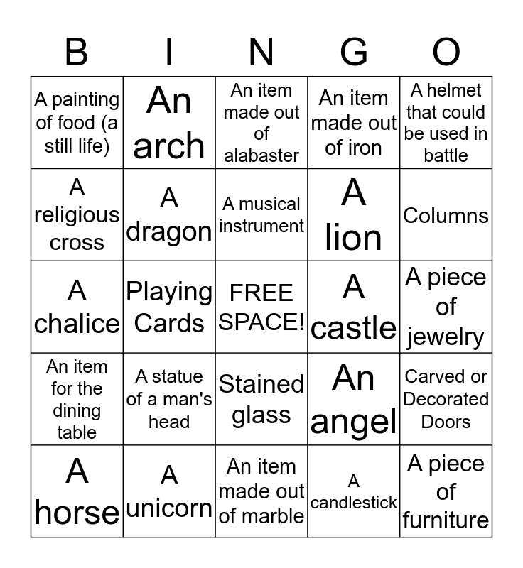 This bingo card has a free space and 24 words: A statue of a man's head, A unicorn, A musical instrument, A horse, A helmet that could be used in battle, A painting of food (a still life), A religious cross, An arch, A castle, Stained glass, A lion, A chalice, An angel, Carved or Decorated Doors, A dragon, A candlestick, A piece of jewelry, An item made out of alabaster, Columns, Playing Cards, A piece of furniture, An item for the dining table, An item made out of iron and An item made out of marble.