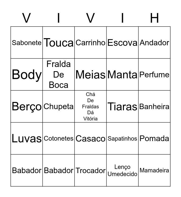 This bingo card has a free space and 24 words: Cotonetes, Babador, Meias, Babador, Andador, Sabonete, Body, Touca, Tiaras, Casaco, Manta, Berço, Sapatinhos, Pomada, Fralda De Boca, Lenço Umedecido, Banheira, Carrinho, Perfume, Chupeta, Mamadeira, Luvas, Escova and Trocador.