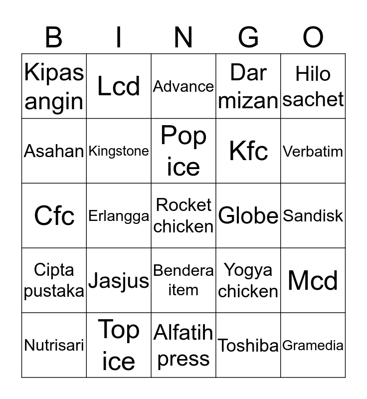 This bingo card has a free space and 24 words: Jasjus, Top ice, Pop ice, Nutrisari, Hilo sachet, Kipas angin, Asahan, Lcd, Globe, Bendera item, Kfc, Cfc, Yogya chicken, Mcd, Kingstone, Toshiba, Sandisk, Advance, Verbatim, Erlangga, Gramedia, Cipta pustaka, Dar mizan and Alfatih press.