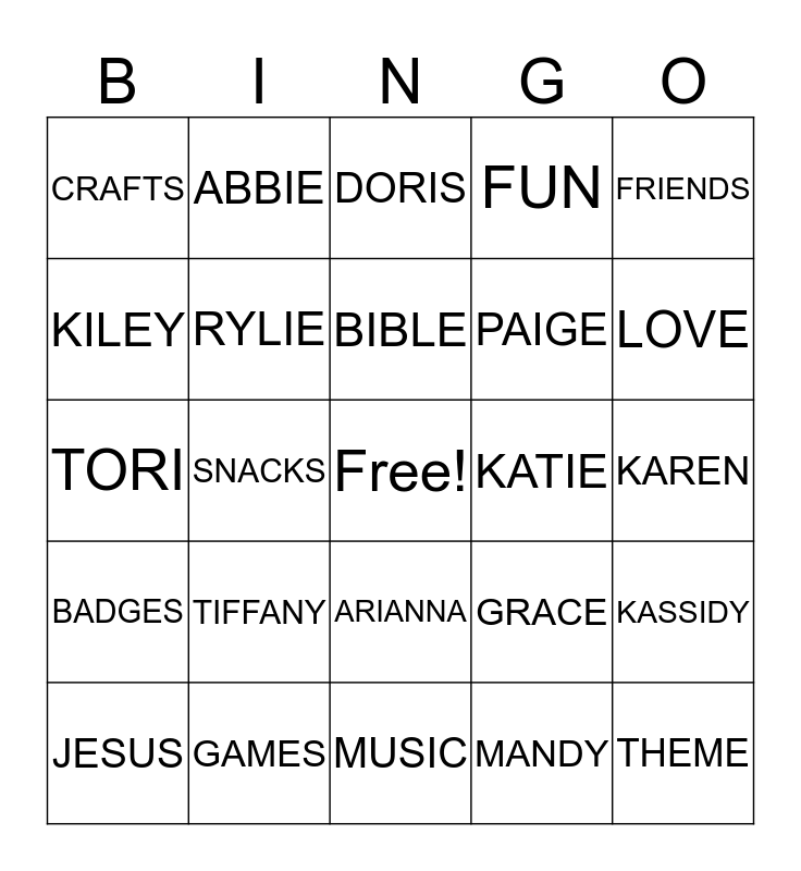 This bingo card has a free space and 24 words: TIFFANY, GAMES, BIBLE, JESUS, FRIENDS, CRAFTS, KILEY, ABBIE, KATIE, ARIANNA, PAIGE, TORI, GRACE, KASSIDY, RYLIE, MANDY, KAREN, DORIS, LOVE, SNACKS, THEME, BADGES, FUN and MUSIC.