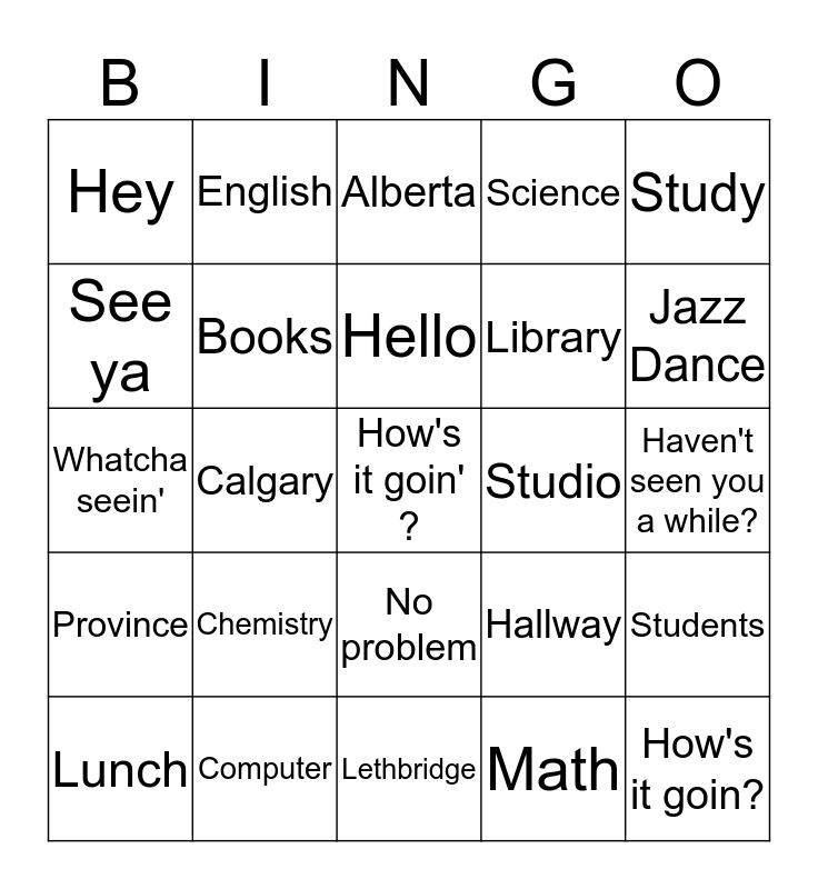 This bingo card has 25 words: Chemistry, Lethbridge, Hello, Lunch, Study, Hey, See ya, English, Studio, No problem, Library, Whatcha seein', Hallway, Students, Books, How's it goin?, Haven't seen you a while?, Alberta, Jazz Dance, Calgary, How's it goin' ?, Computer, Province, Science and Math.