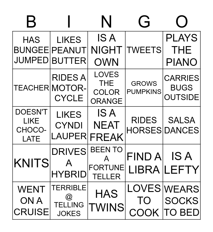 This bingo card has 25 words: DRIVES A HYBRID, HAS TWINS, LOVES THE COLOR ORANGE, WENT ON A CRUISE, PLAYS THE PIANO, HAS BUNGEE JUMPED, TEACHER, LIKES PEANUT BUTTER, RIDES HORSES, BEEN TO A FORTUNE TELLER, GROWS PUMPKINS, DOESN'T LIKE CHOCO-LATE, FIND A LIBRA, IS A LEFTY, RIDES A MOTOR-CYCLE, WEARS SOCKS TO BED, SALSA DANCES, IS A NIGHT OWN, CARRIES BUGS OUTSIDE, LIKES CYNDI LAUPER, IS A NEAT FREAK, TERRIBLE @ TELLING JOKES, KNITS, TWEETS and LOVES TO COOK.