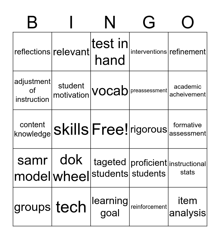 This bingo card has a free space and 24 words: dok wheel, tech, vocab, groups, refinement, reflections, adjustment of instruction, relevant, rigorous, tageted students, preassessment, content knowledge, proficient students, instructional stats, student motivation, reinforcement, formative assessment, test in hand, academic acheivement, skills, item analysis, samr model, interventions and learning goal.