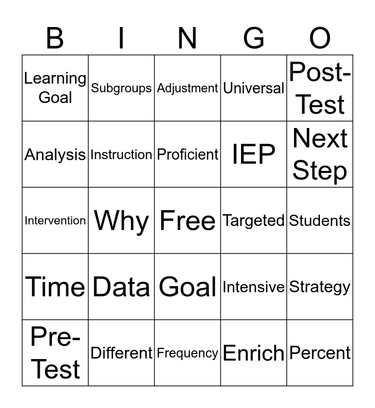 This bingo card has a free space and 24 words: Data, Different, Proficient, Pre-Test, Post-Test, Learning Goal, Analysis, Subgroups, Targeted, Goal, IEP, Intervention, Intensive, Strategy, Instruction, Enrich, Students, Adjustment, Next Step, Why, Percent, Time, Universal and Frequency.