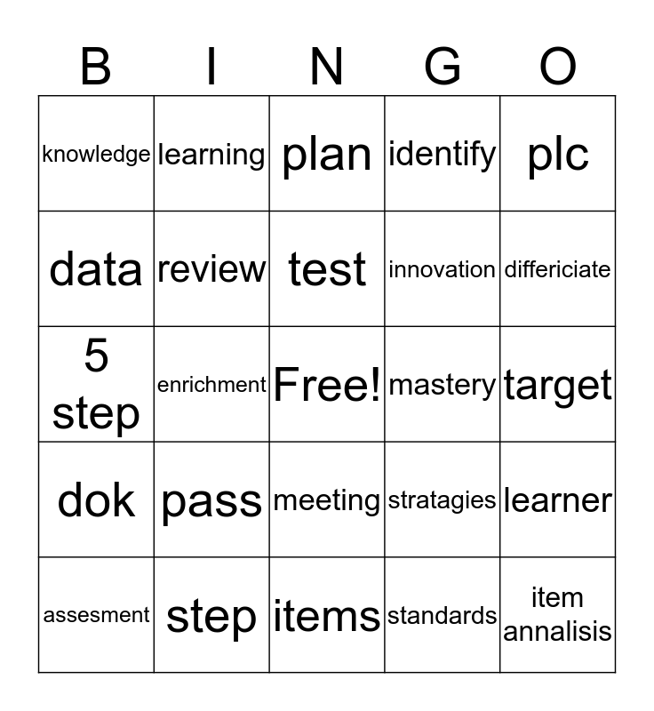 This bingo card has a free space and 24 words: pass, step, test, assesment, plc, knowledge, data, learning, mastery, meeting, innovation, 5 step, stratagies, learner, review, standards, target, plan, differiciate, enrichment, item annalisis, dok, identify and items.