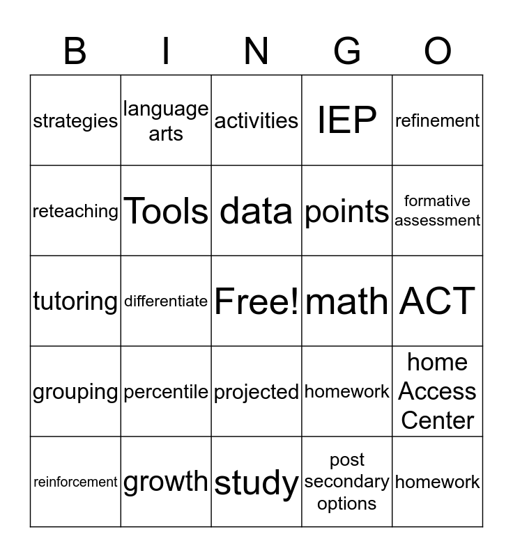 This bingo card has a free space and 24 words: percentile, growth, data, reinforcement, refinement, strategies, reteaching, language arts, math, projected, points, tutoring, homework, home Access Center, Tools, post secondary options, ACT, activities, formative assessment, differentiate, homework, grouping, IEP and study.